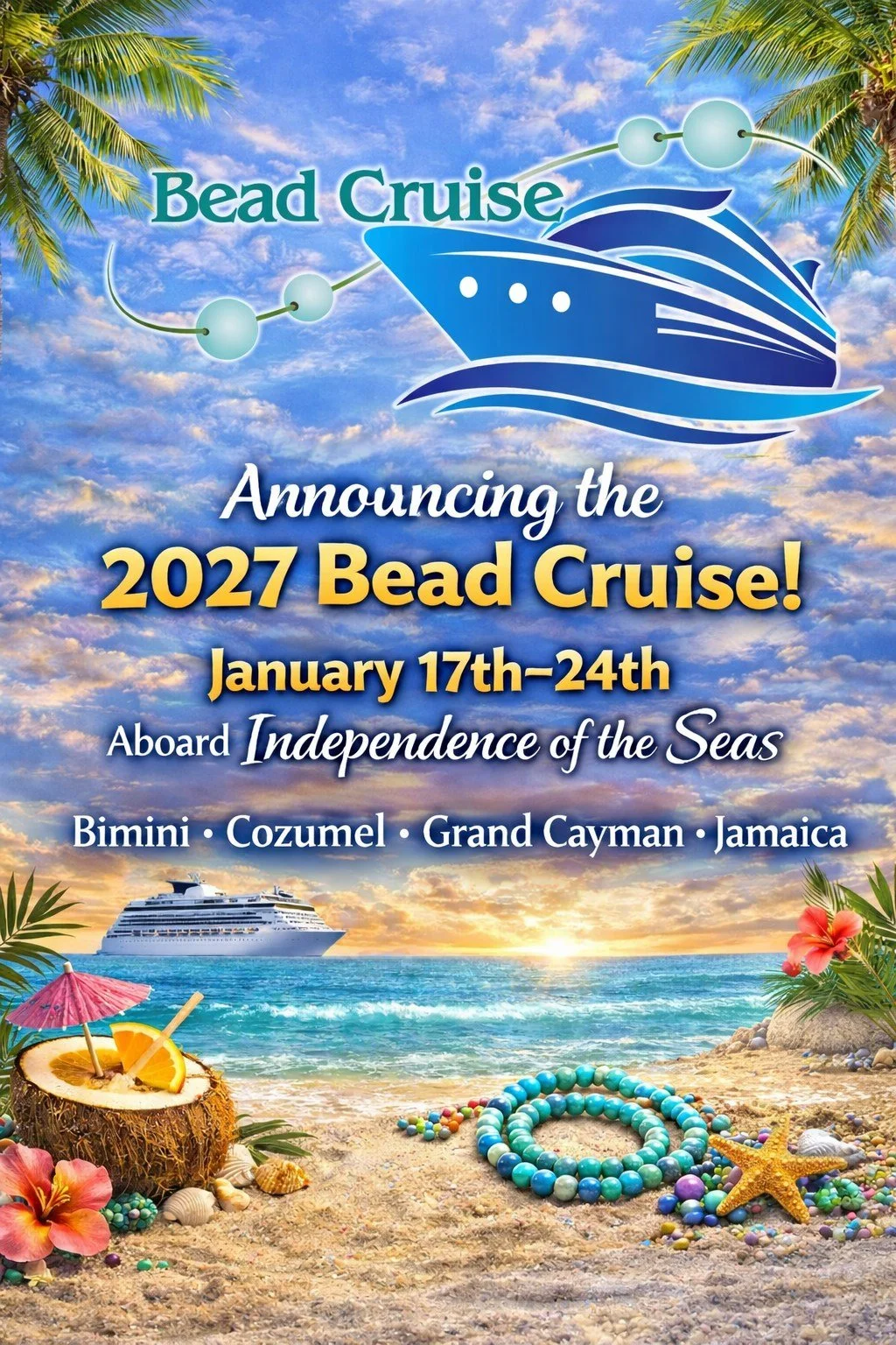 Join us for our 21st annual Bead Cruise - January 17th–24th, 2027 as we sail away on an 7-night Western Caribbean Cruise! We'll sail on Royal Caribbean's independence of the Seas from Miami, FL visiting -